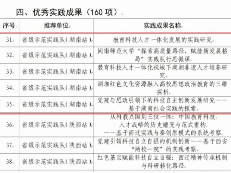 近日,中共福建省委教育工作委员会公布“追寻领袖足迹 担当强国使命”2025年全省大学生暑期社会实践活动获奖名单,我院“探索高质量路径,赋能新发展格局”省级示范实践队获评全省“优秀实践团队”,我院陈再生院长和团委书记潘怀杰指导的“教育科技人才一体化发展的实践研究”暑期社会实践总结报告”和“闽南师范大学‘探索高质量路径,赋能新发展格局’实践队行思微课”视频、陈源充老师指导的“教育科技人才一体化视域下湖湘非遗人才培养研究”学术论文、姚禹老师指导的“党建与思政引领下的科技自主创新发展研究--基于湖南社会实践的探索”学术论文以及我院学生章海龙撰稿,文学院洪水英老师指导的“湖湘红色文化资源融入高校思想政治教育的三维探析”学术论文获评全省“优秀实践成果”。我院团委书记潘怀杰、姚禹老师、2024级思想政治教育专业许婧、章海龙、杨纯真荣评全省“优秀实践个人”。