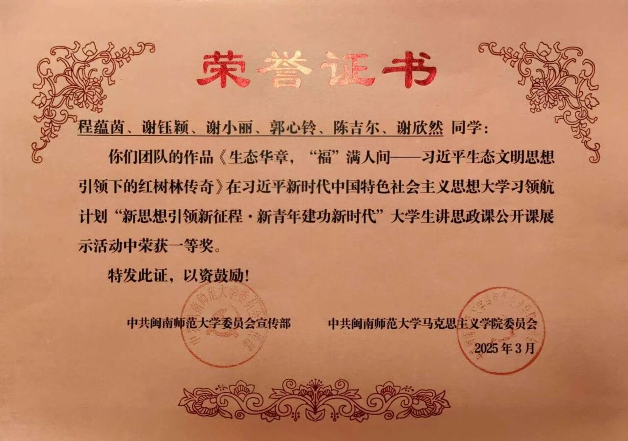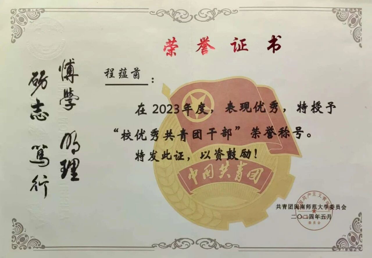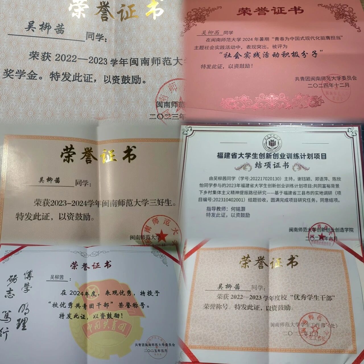 吴柳茜,2022级思想政治教育专业,共青团员,现已推免并被录取到全国重点马院福建师范大学马克思主义学院攻读硕士研究生。四年本科班班长,负责的班集体获得校级集体一等奖等9项荣誉;个人获校“三好生标兵”、“三好生”、“优秀共青团干部”、“优秀学生干部”、“社会实践积极分子”、校“大学生讲思政课”一等奖、校“奋斗者正青春”主题演讲优秀奖、闽南师范大学规范汉字书写大赛一等奖、校舞蹈赛三等奖等奖项30余项;负责主持国家级大学生创新创业训练计划项目一项并顺利结题;多次荣获闽南师范大学专业奖学金。