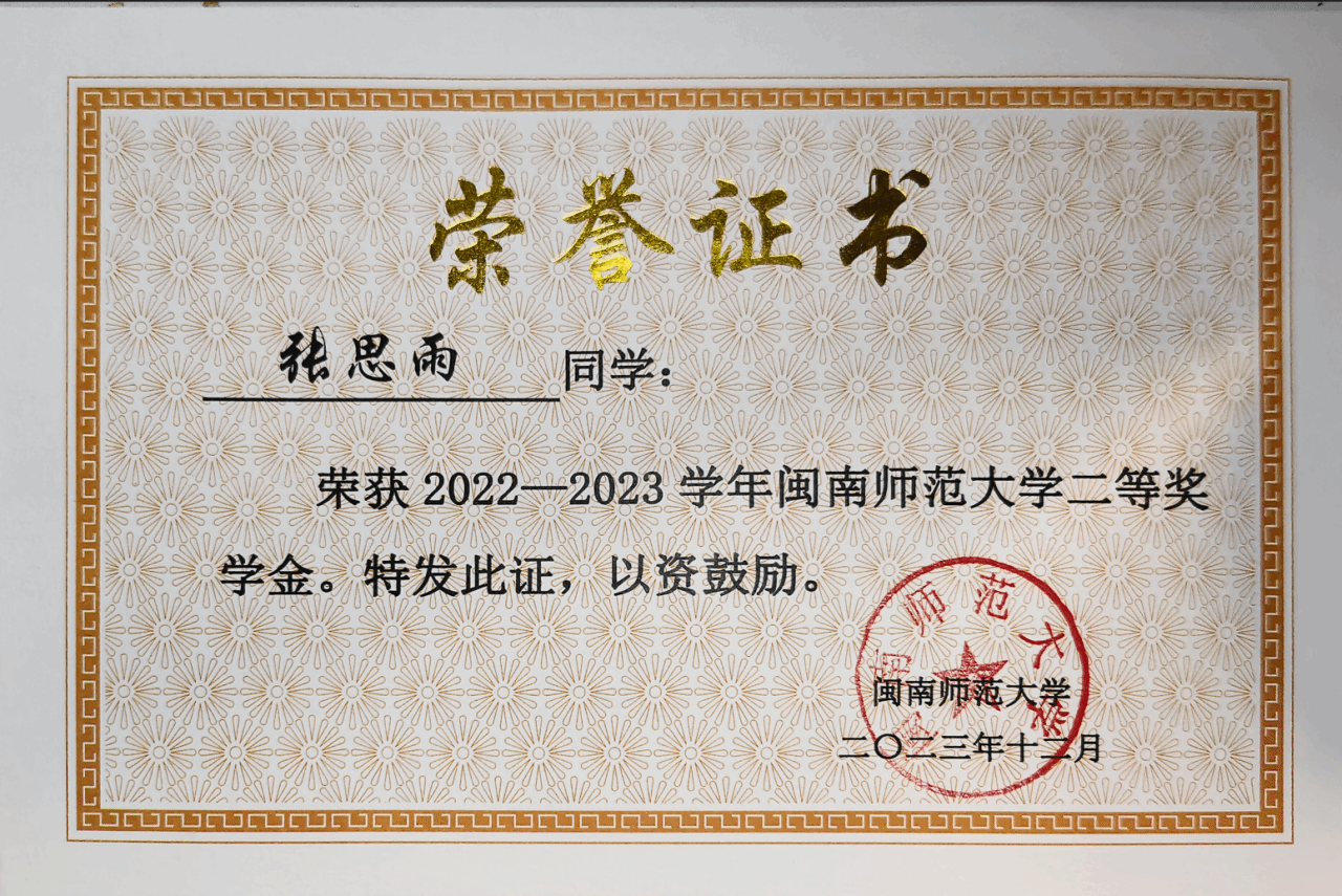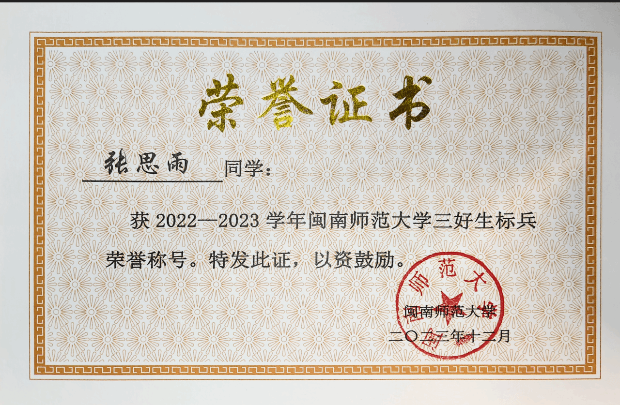 张思雨,2022级思想政治教育专业,中共党员,在部属华中师范大学推免生面试中以第五名成绩被录取为该校硕士研究生。她曾任马克思主义学院团委学生副书记、校读者服务中心副主任。曾获得校“三好生标兵”、校“三好生”、校级二等奖学金、校级三等奖学金、校“大学生讲思政课”公开课展示活动一等奖、校师范生技能大赛初中道德与法治组一等奖、第十五届全国大学生电子商务“创新、创意及创业”挑战赛校级赛一等奖、福建省大学生暑期文化科技卫生“三下乡”社会实践活动先进个人、第十七届“挑战杯”福建省大学生课外学术科技作品竞赛(主体赛)三等奖等30项奖项。