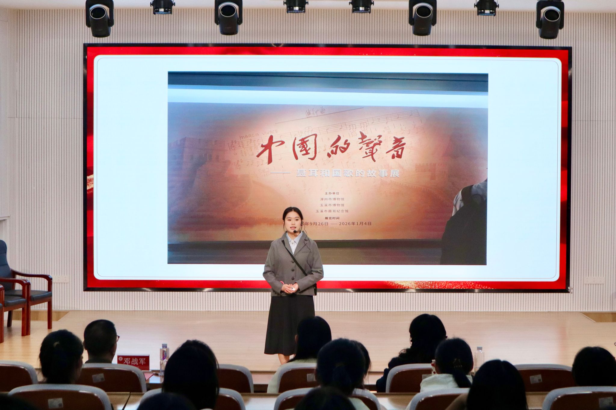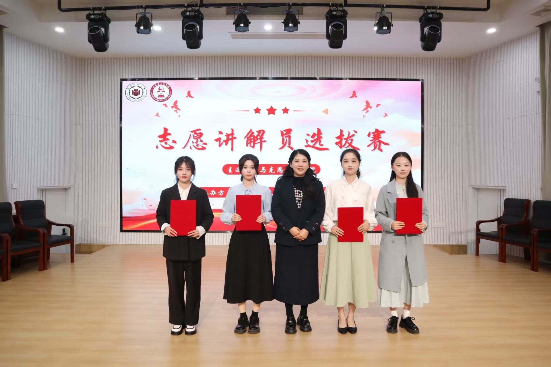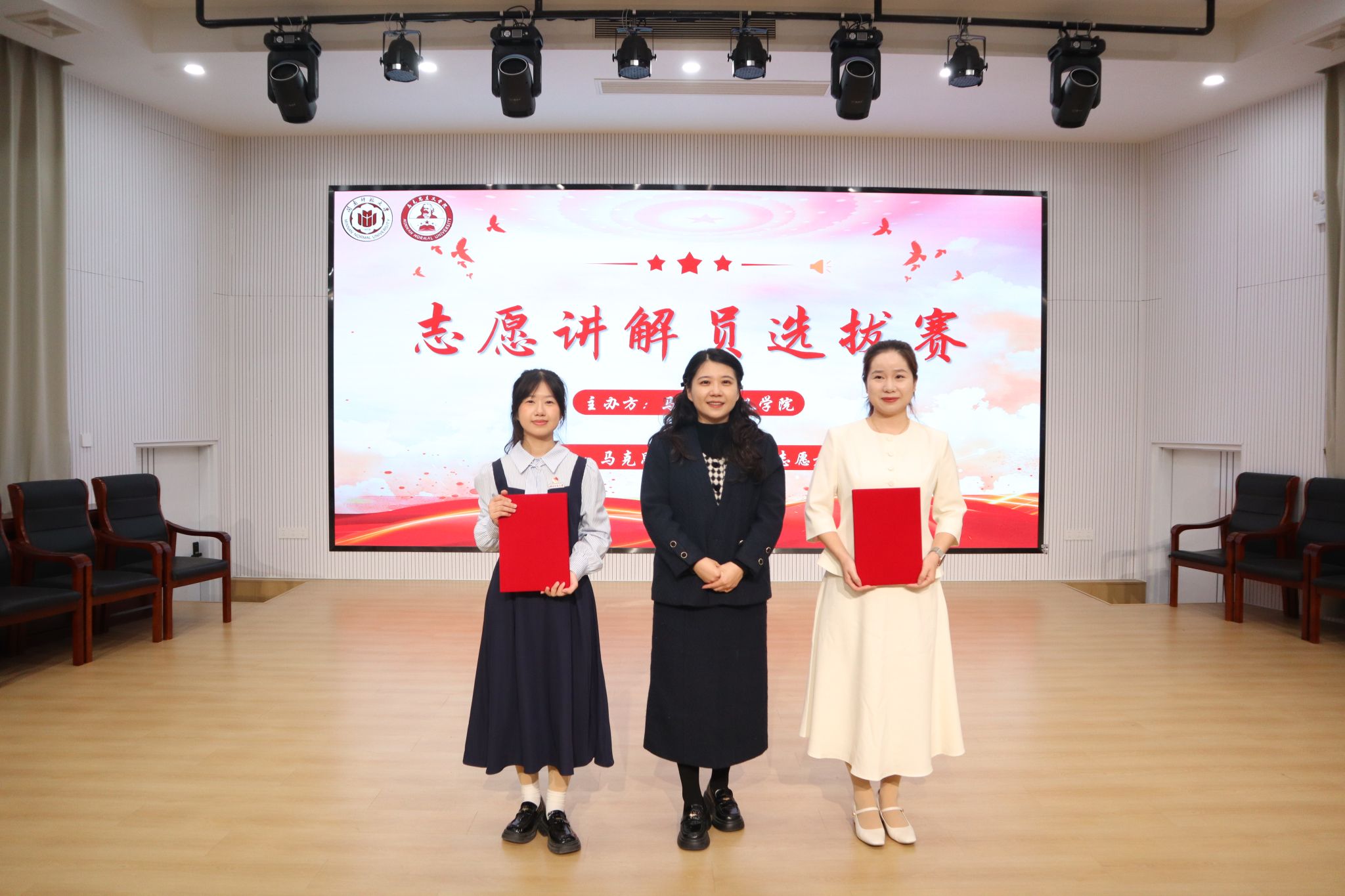 为积蓄奋进力量,传承拼搏精神及家国情怀,11月26日晚,我院于东门马院礼堂举办第二届红色文化志愿讲解员选拔赛。比赛邀请漳州中国女排精神展示馆展陈部主任黄专楠、校党委宣传部陈秋燕老师、校办公室汪先平老师担任评委,我院党委副书记邓战军老师出席,25级本科生蒋明芳、黄雨萱主持。