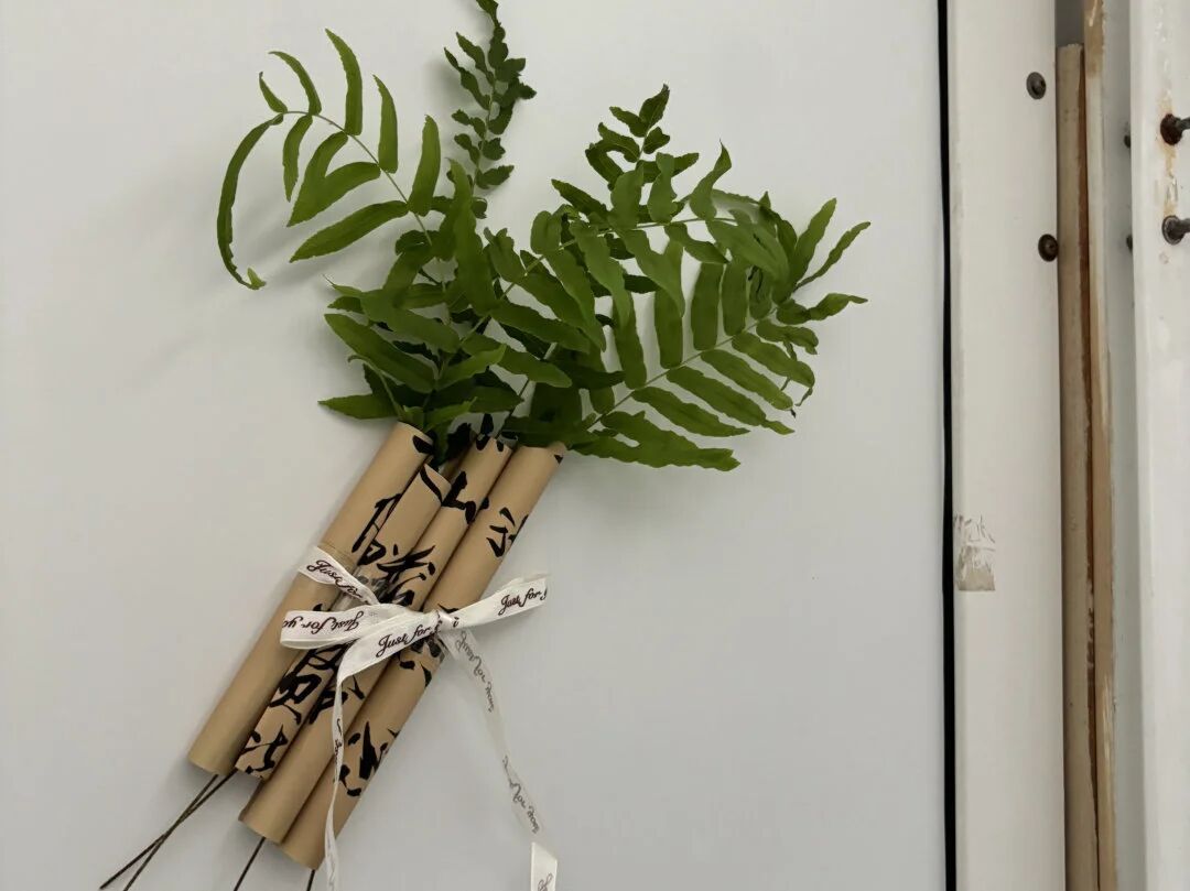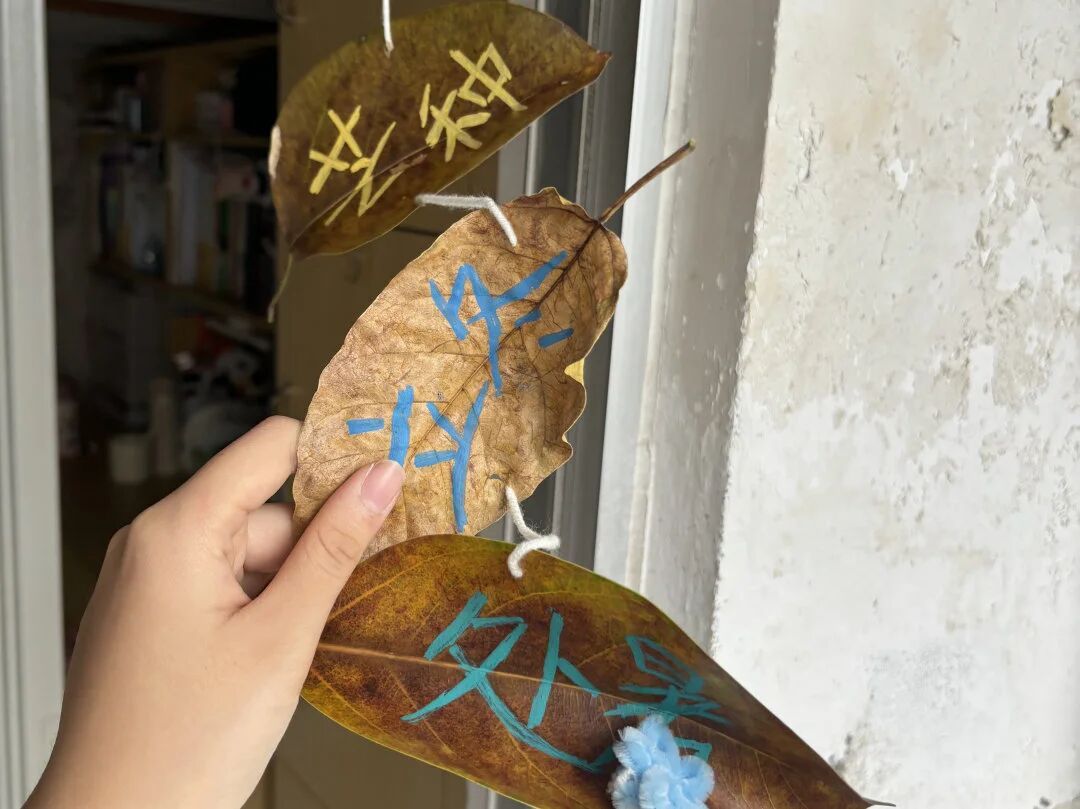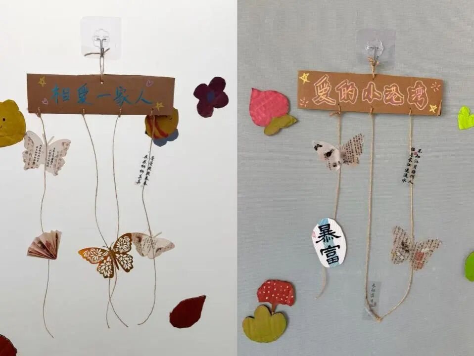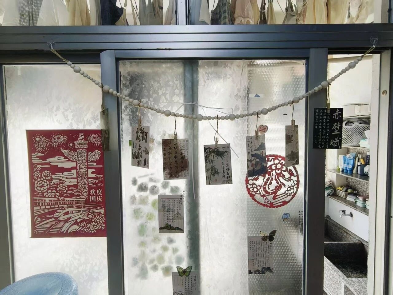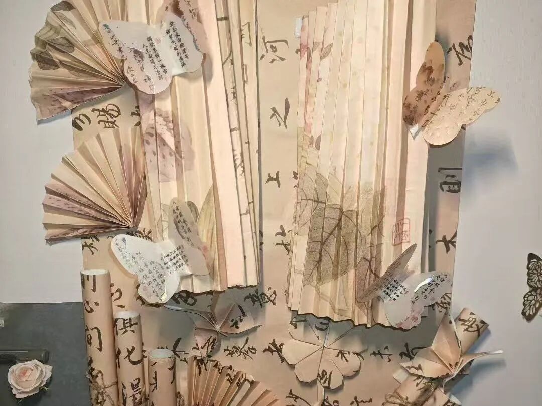 达理2A504宿舍秉持 “变废为宝、循环利用” 环保理念,紧扣文化传承主题打造特色空间。成员们巧用闲置物品:废弃纸板制成作息状态板,闲置纸张剪出非遗剪纸,小黑板书写经典诗词,树叶、包装纸边角料、扭扭棒等化作创意装饰。厕所门贴《兰亭序》配纸扇,浴室门用废纸筒改造点缀书法纸与蕨叶,书架上典籍与手作相映。低成本创意践行环保,传承文脉,让宿舍成为满含温暖记忆的文化小窝。