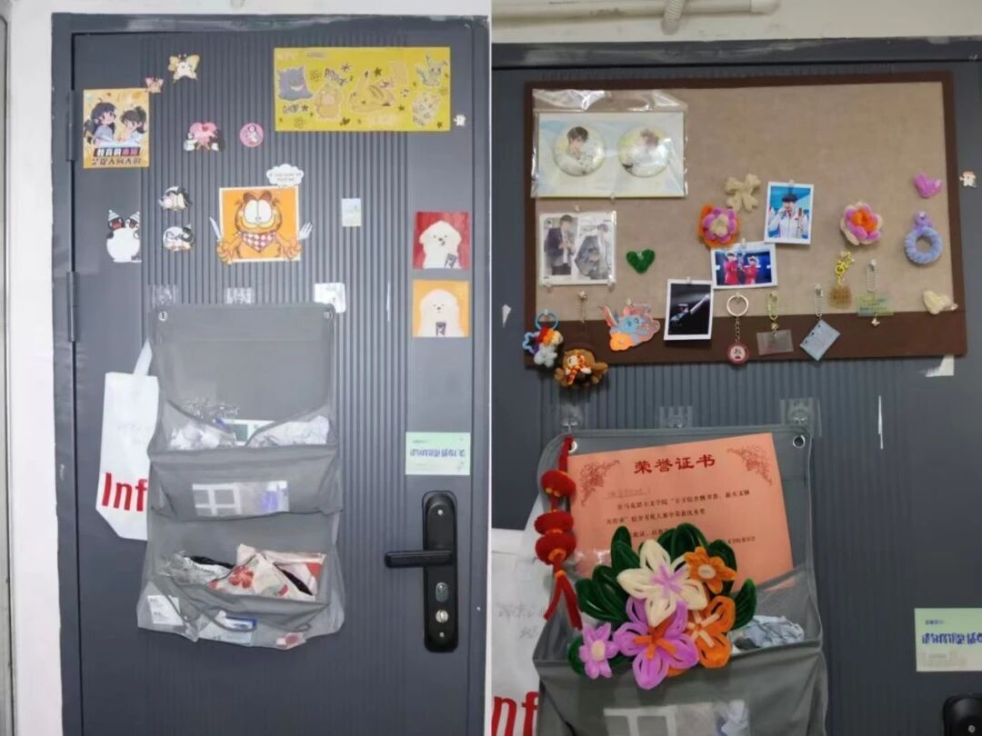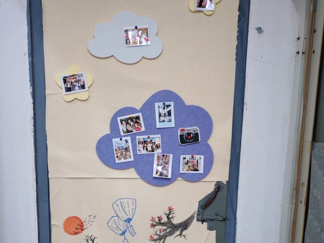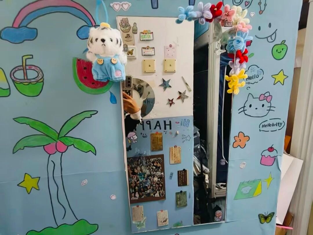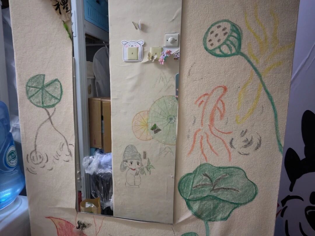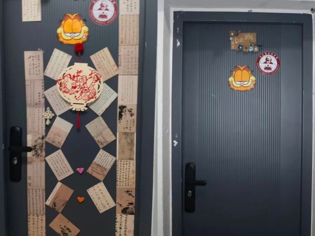紧扣 “方寸宿舍飘书香,薪火文脉共传承” 主题,达理2A408以 “长留舍” 为门牌,寄寓成员 “长久相伴相守” 的心意。进门处云朵造型照片墙,藏着青春笑靥,彰显 “和乐” 意涵;两侧手绘墙以水墨铺展荷莲、山水,缀纸艺装饰,尽显中式清雅;玻璃门错落张贴古典修身书法,让书香浸润日常。宿舍以生活为载体,让传统文脉与青春意趣共生诗意。