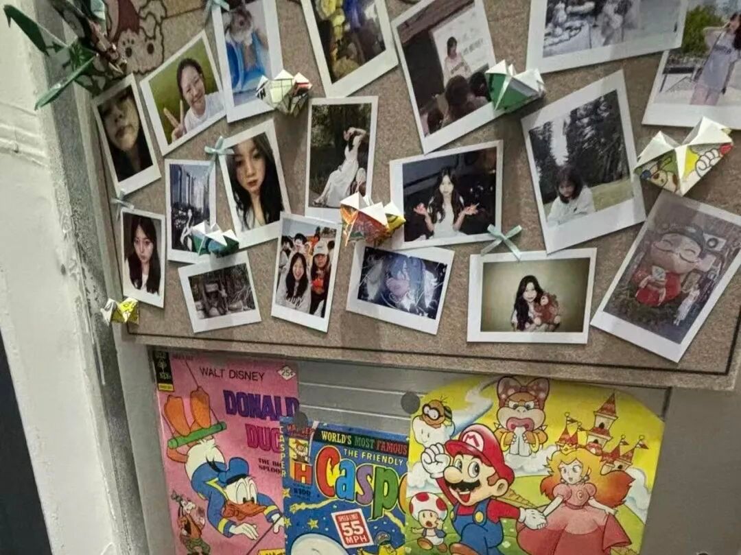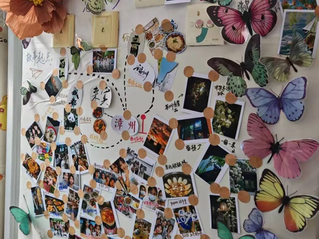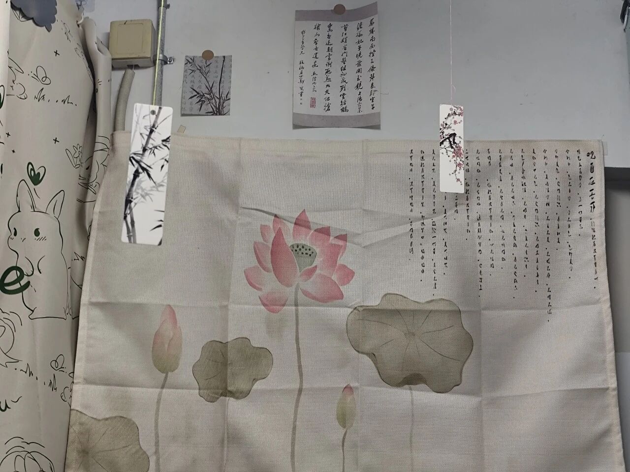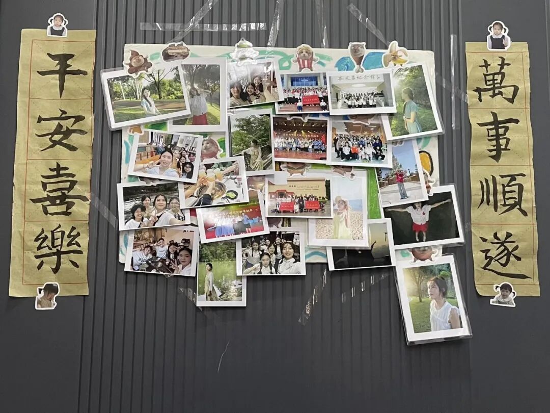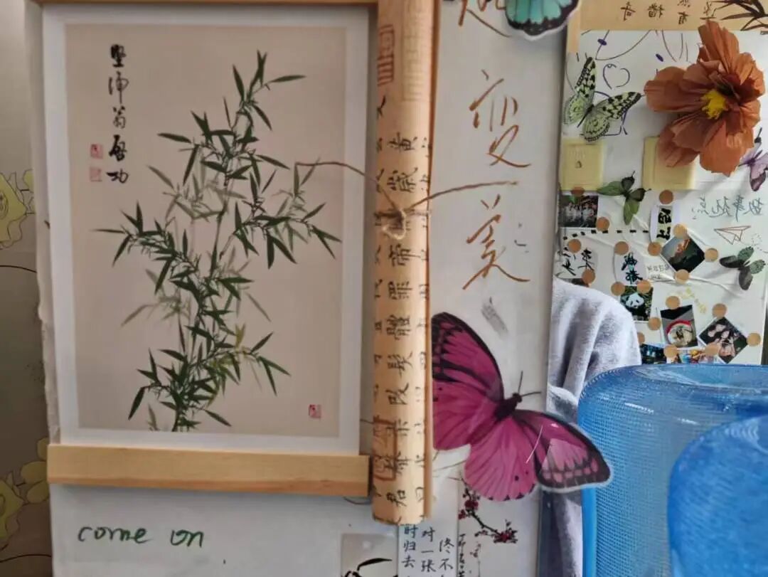 “曲径通幽处,宿舍美化妙趣横生”,达理2A505宿舍是6人温暖治愈空间。“五” 含五行深意,“六” 喻德顺和谐,契合 6 人异乡相融的默契。宿舍门仿故宫 “养心殿”,贴梅竹书签、插绿意字帖卷筒。室内照片墙定格多地记忆,剪纸点缀;镜旁挂竹子画警醒正直,天花板悬书签如风铃。深处 “诗意小角”,灯光轻纱映长卷书画,“滕王阁” 扇、荷花帘幕蕴意境,尽显修养身心的惬意。