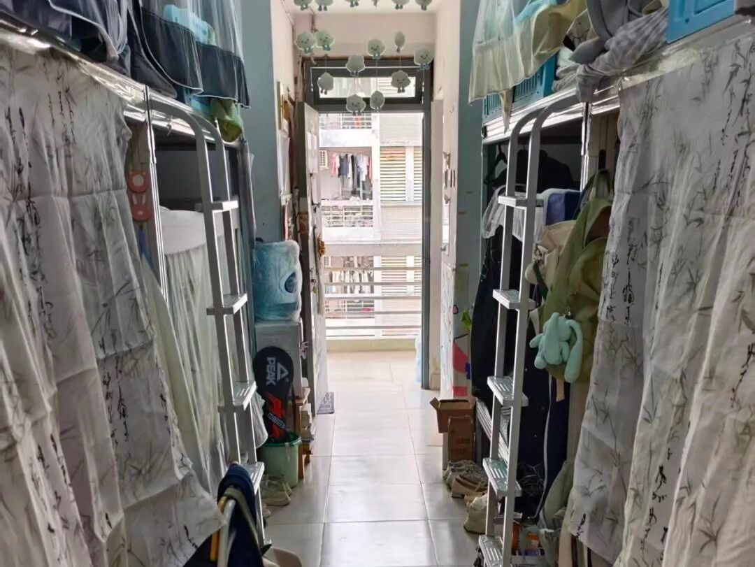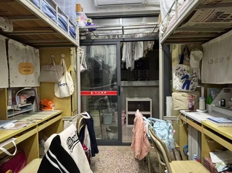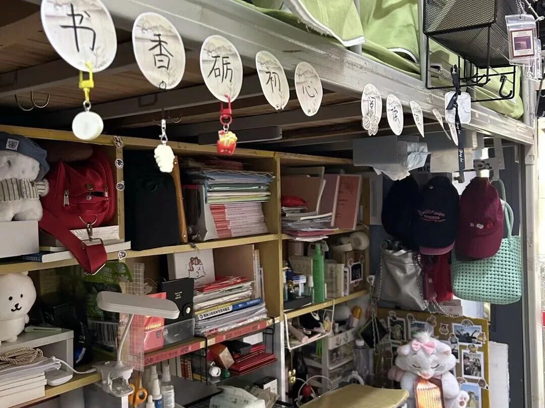 这间宿舍摒弃花哨装饰,以笔墨、草木意象打造满含书香与心意的小天地,让文脉雅致融入日常。竹影墨字帘子为桌位隔出文气空间,门板贴手写书法、挂编织挂饰,兼具心意与青春温柔。墙面软木板钉着竹枝信笺与抄录句子,旁配旅途风景照,墨香与生活欢喜相融;天花板垂着云朵挂饰,柔化雅致氛围。细节间尽显对文字的喜爱与对生活的用心,让小屋藏着青春柔软与对旧时光的敬意。