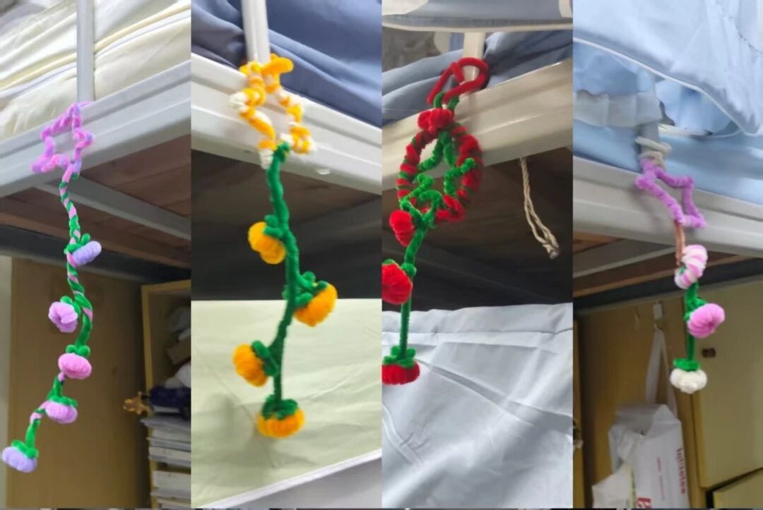 紧扣 “方寸宿舍飘书香,薪火文脉共传承” 主题,该宿舍以 “青春记忆织文脉,书香雅韵筑栖居” 为核心,将传统笔墨与青春日常相融。以古风宣纸为基底,铺陈书法、印章元素,搭配手工卷轴、纸扇,让古籍雅致融入日常;军训、团建等照片嵌入书法背景,缀以 “生生鹭鹭” 书签、昵称牌,让青春记忆与传统雅韵共生。麻绳、纸蝴蝶等手工DIY装饰串联空间,既显集体巧思又保整洁,使宿舍成为兼具文化质感与生活温度的传承之地。