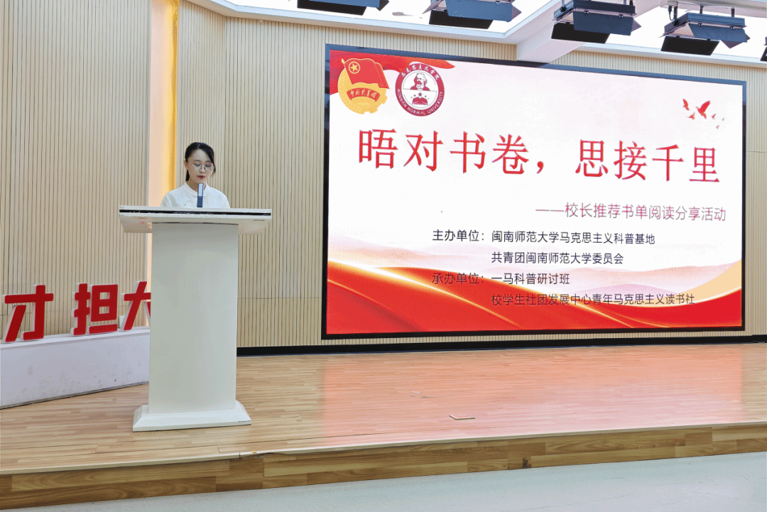 为深入学习并贯彻党的二十届四中全会精神,全面落实“深化全民阅读活动”的战略部署,引导广大师生在阅读中坚定文化自信、提升思想境界、汲取智慧力量、拓宽认知视野,10月31日晚,我校在达理活动中心三楼成功举办“晤对书卷,思接千里”校长推荐书单阅读主题活动。本次活动由闽南师范大学马克思主义科普基地、共青团闽南师范大学委员会主办,一马科普研讨班、校学生社团发展中心青年马克思主义读书社联合承办。闽南师范大学团委书记童娟老师、马克思主义学院党委副书记邓战军老师、马克思主义学院副教授姚禹老师出席活动。 本次活动以校长精心挑选的书单为核心,营造出书香氤氲、思想交融的浓厚氛围。教师代表与学生共读人共聚一堂、共同研讨经典著作,围绕著作内容精髓,结合当下社会热点议题进行了深入对话,现场交流热烈,思想碰撞间迸发智慧火花,交流成效显著。