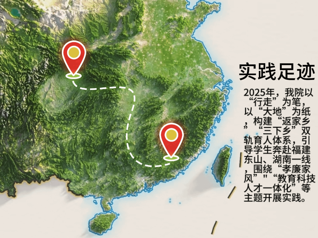 2025年,我院以“行走”为笔,以“大地”为纸,构建“返家乡”“三下乡”双轨育人体系,引导学生奔赴福建东山、湖南一线,围绕“孝廉家风”“教育科技人才一体化”等主题开展实践。一批批青年足迹印刻乡土,一场场实践跃然报端——人民网、新福建、多彩大学生网等主流媒体20余次聚焦报道,形成“实践—凝练—传播”的育人闭环。学生在基层熔炉中锤炼品格,在服务奉献中彰显担当,团队与个人屡获表彰,擦亮了我院实践育人的鲜明底色。