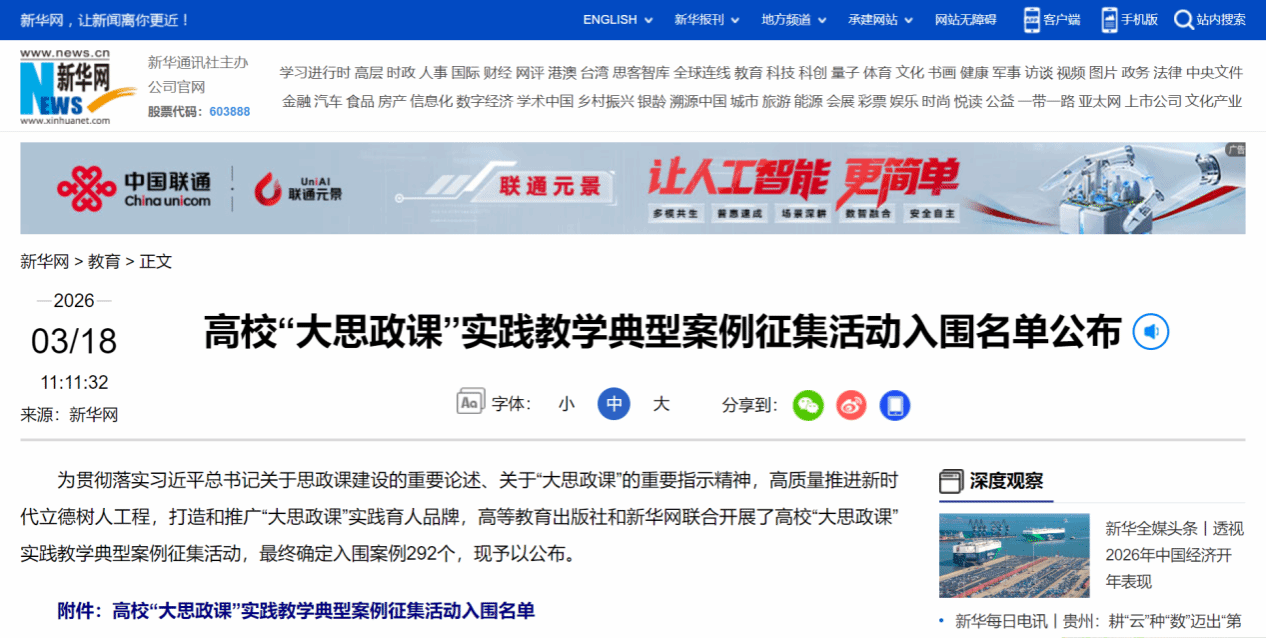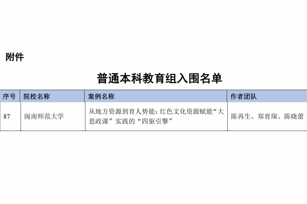 近日,由高等教育出版社与新华网联合开展的高校“大思政课”实践教学典型案例征集活动结果正式发布。该活动于2025年9月启动,旨在深入贯彻落实习近平总书记关于思政课建设的重要论述,高质量推进新时代立德树人工程,打造和推广“大思政课”实践育人品牌。据悉,此次活动共收到来自全国数百所高校的千余个实践教学案例,经过专家团队多轮严格评审,最终确定入围案例292个。闽南师范大学马克思主义学院陈再生、郑育琛、陈晓蕾团队申报的《从地方资源到育人势能:红色文化资源赋能“大思政课”实践的“四驱引擎”》案例成功入选。
