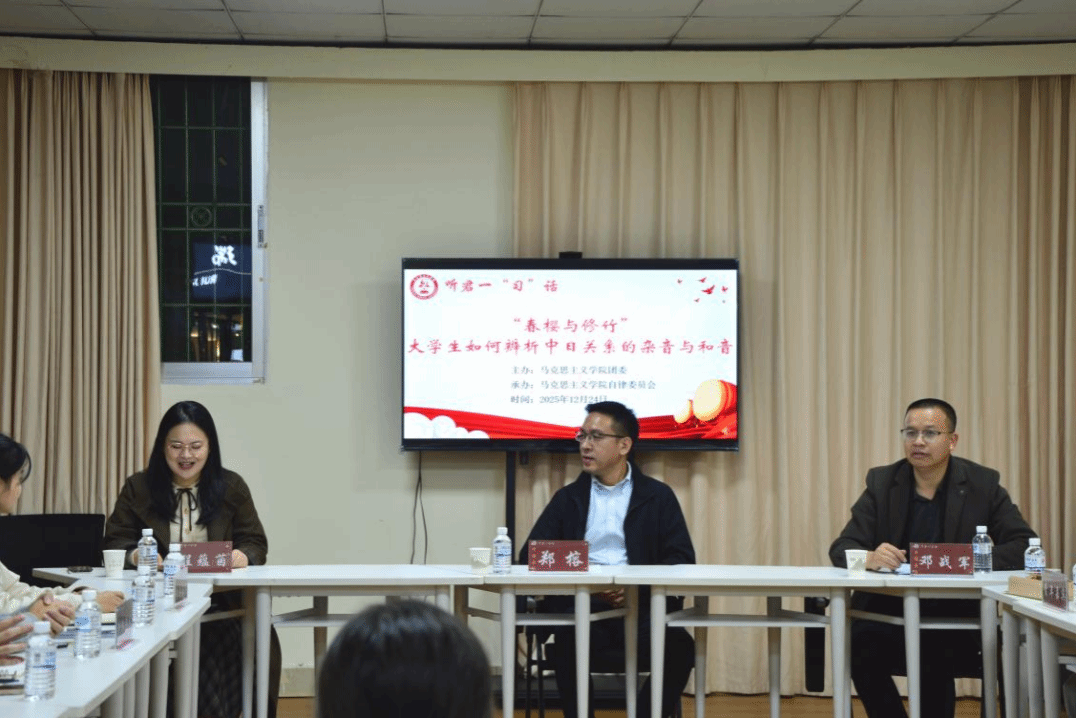 为融合贯通思政小课堂和社会大课堂,打造新时代思政教育的新场域,培养青年学生复兴中华民族的使命和责任感,12月24日晚,我院于瑞京公寓一站式社区—桃李苑开展主题为“漫谈中日关系的杂音与和音”第六期“听君一‘习’话”师生联学活动。历史地理学院副院长郑榕教授、我院党委副书记邓战军及部分学院青年嘉宾及30余名师生参加,活动由2022级程蕴茵同学主持。