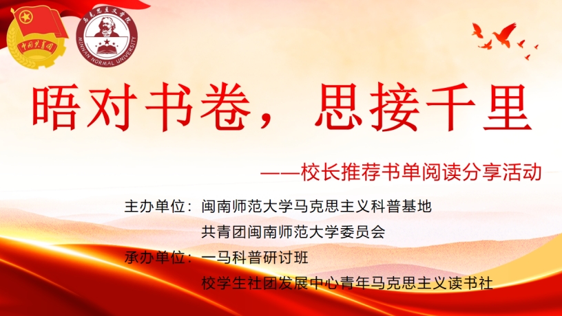本次活动由闽南师范大学马克思主义科普基地、共青团闽南师范大学委员会主办,一马科普研讨班、校学生社团发展中心青年马克思主义读书社联合承办。闽南师范大学团委书记童娟老师、马克思主义学院党委副书记邓战军老师、马克思主义学院副教授姚禹老师出席活动。 本次活动以校长精心挑选的书单为核心,着力营造书香氤氲、思想交融的浓厚氛围。教师代表与学生共读人共聚一堂、共同研讨经典著作,围绕著作内容精髓,结合当下社会热点议题进行了深入对话,现场交流热烈,思想碰撞间迸发智慧火花,交流成效显著。