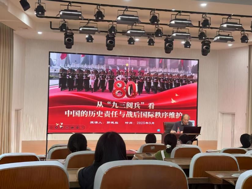 9月25日,福建江夏学院马克思主义学院首任院长郭健彪教授到我校东门梯教二楼报告厅为我院师生作“从九三阅兵看中国的历史责任与战后国际秩序维护”专题讲座,院党委副书记邓战军主持。(通讯员 周榆幸)