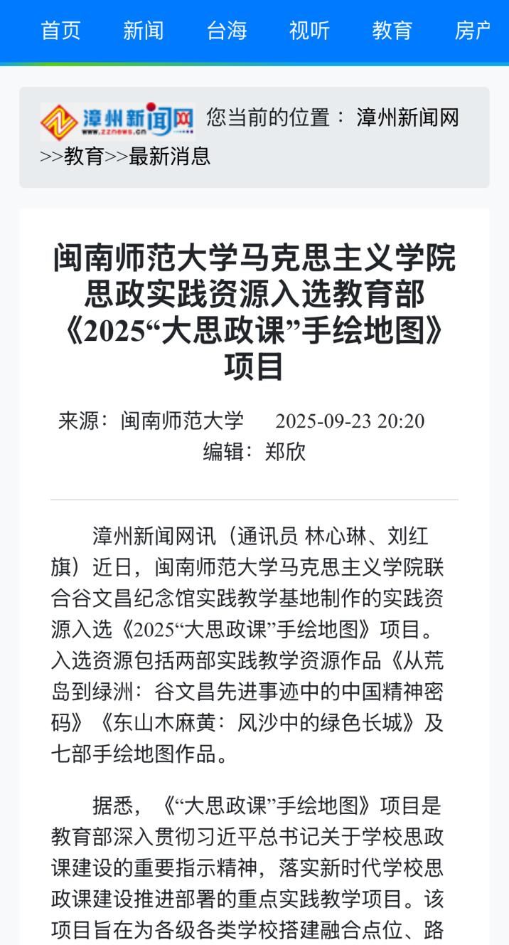 1、漳州新闻网:闽南师范大学马克思主义学院思政实践资源入选教育部《2025“大思政课”手绘地图》项目