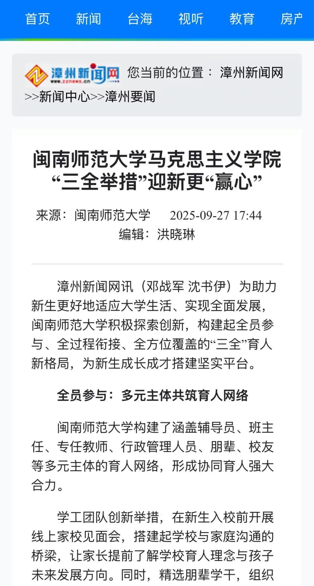 2、漳州新闻网:闽南师范大学马克思主义学院“三全举措”迎新更“赢心”