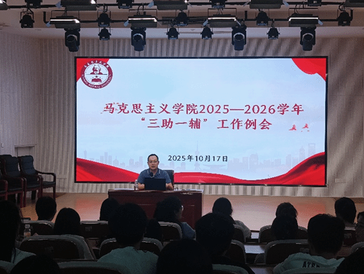 10月17日下午,我院于东门梯教马院礼堂召开马克思主义学院2025-2026学年“三助一辅”工作例会。会议由我院团委书记潘怀杰主持,我院全体研究生兼职辅导员、助管参会。(通讯员 杨纯真)