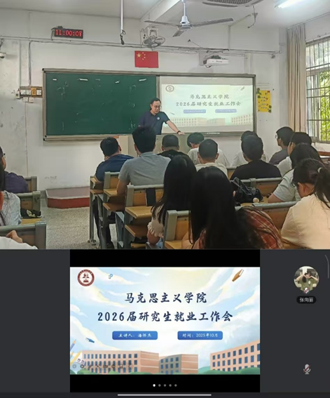 10月16日上午,我院在综合楼南区201召开2026届研究生就业工作会,本次会议由我院团委书记潘怀杰主持,院党委副书记邓战军作相关指导,23级学硕班线下参会,24级专硕班线上同步参与。 (通讯员 许婧)